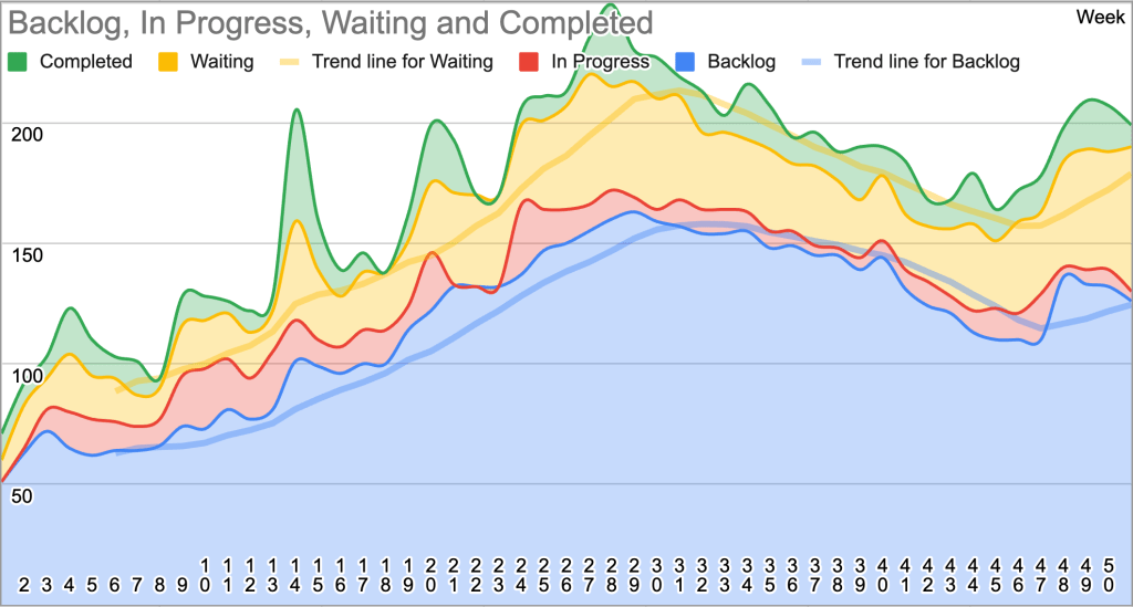 The above is my first full year (January to December) as a civil servant. I started in the bottom left corner on week one and some tasks in my backlog and progressed steadily through the year to the top right corner in week 51. Of course, there are some variations from week to week, but the thicker lines show that things are surprisingly constant on (six week) average.